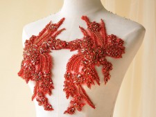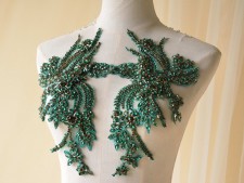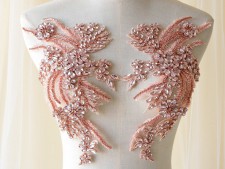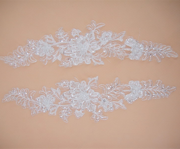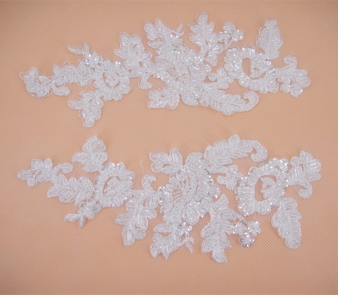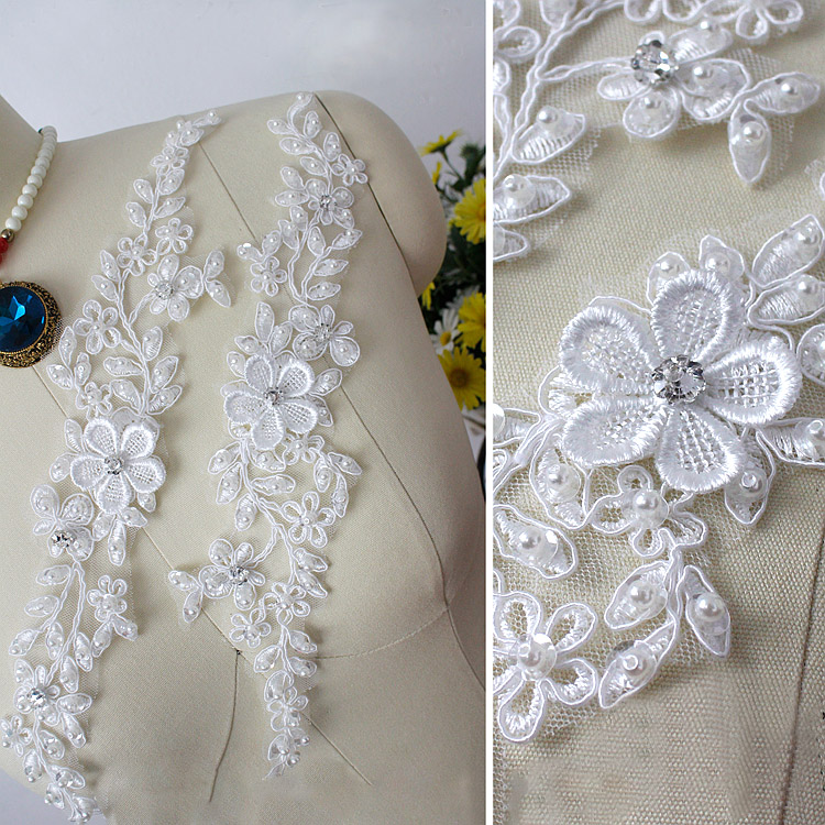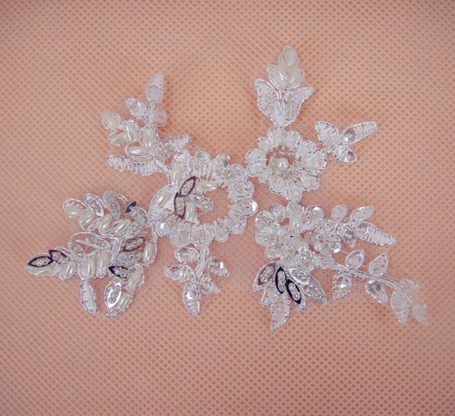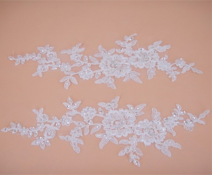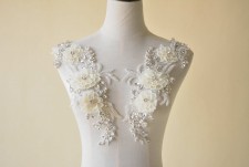 Bridal Lace Applique Beaded Motif Floral Sewing on Trim 1 Pair