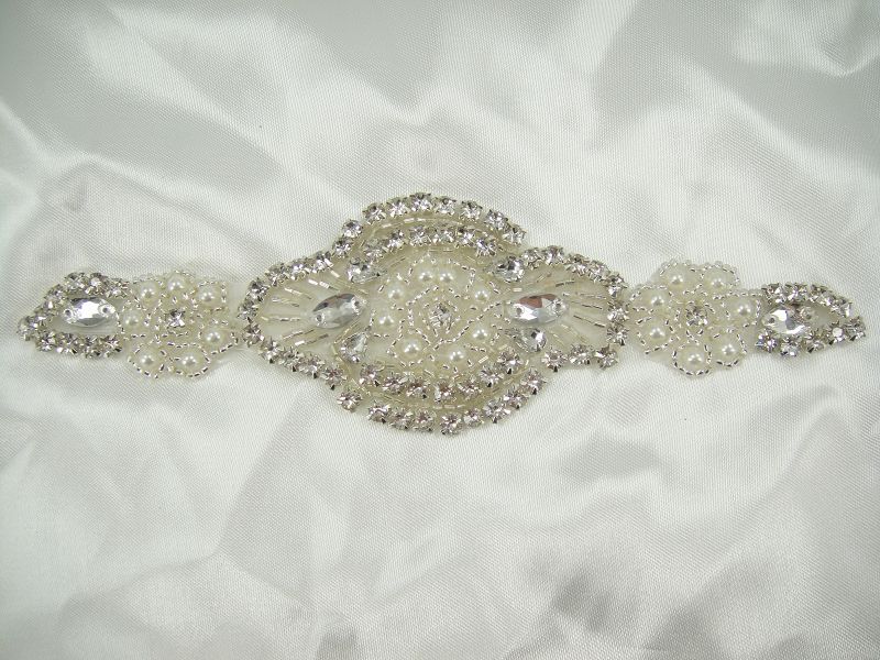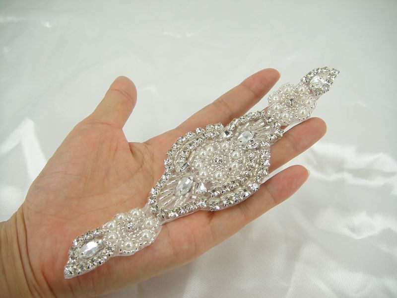 Stunning luxury wedding / bridal applique with high quality crystal rhinestones, beads, rhinestones and beads are all hand sewn .