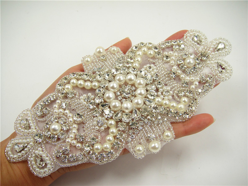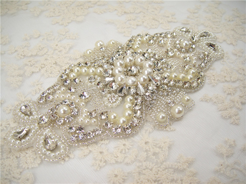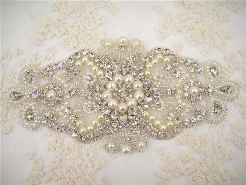 Stunning luxury wedding / bridal applique with high quality crystal rhinestones, beads, rhinestones and beads are all hand sewn .