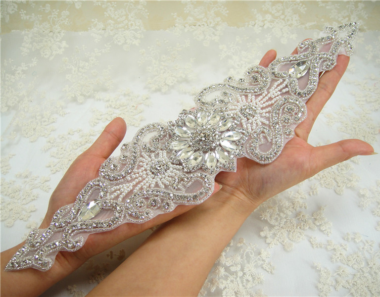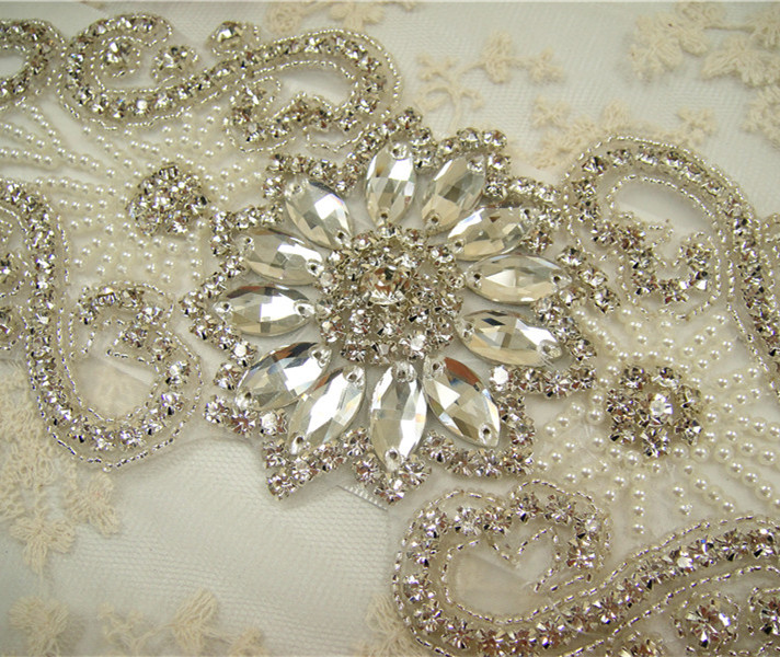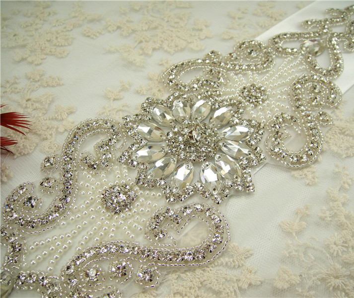 Stunning luxury wedding / bridal applique with high quality crystal rhinestones, beads, rhinestones and beads are all hand sewn .
