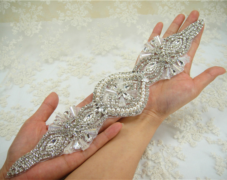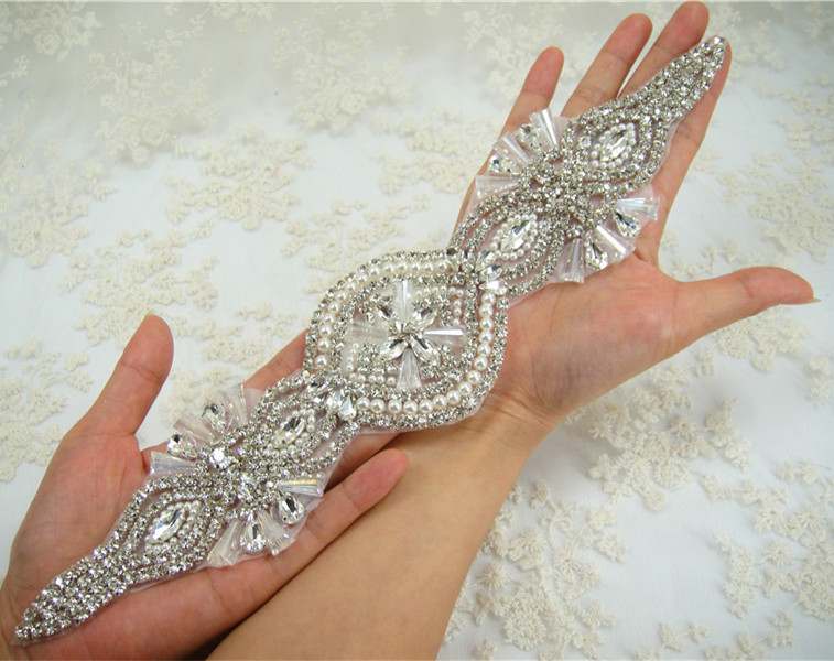 Stunning luxury wedding / bridal applique with high quality crystal rhinestones, beads, rhinestones and beads are all hand sewn .