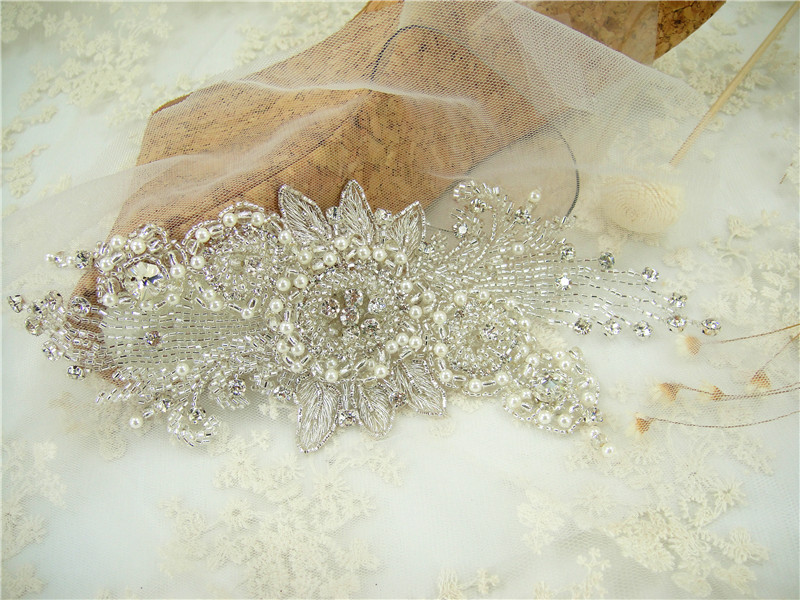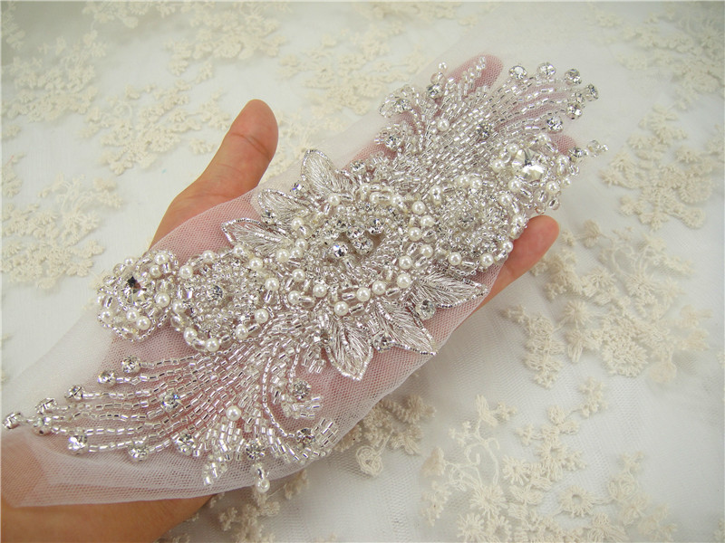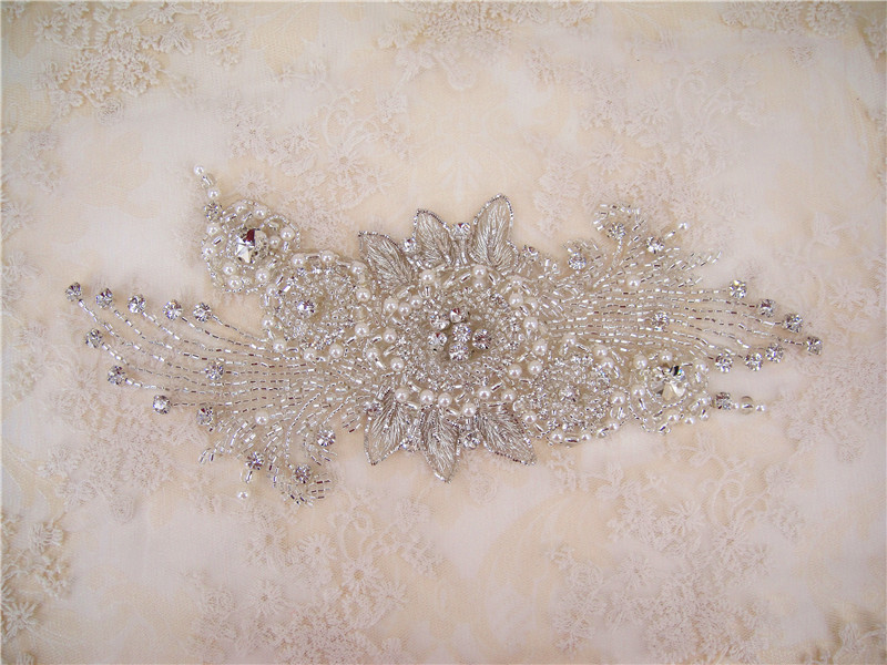 Stunning luxury wedding / bridal applique with high quality crystal rhinestones, beads, rhinestones and beads are all hand sewn .